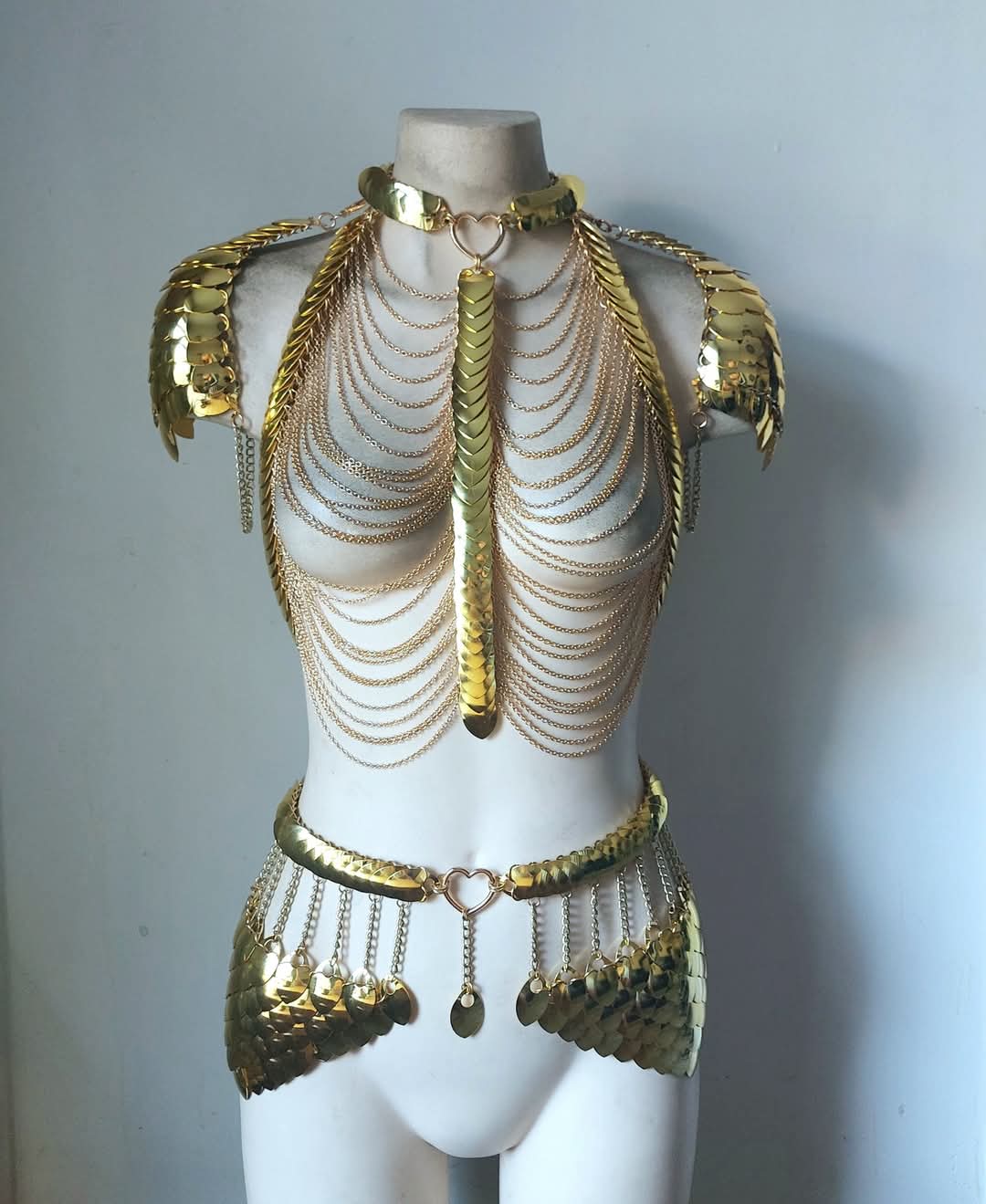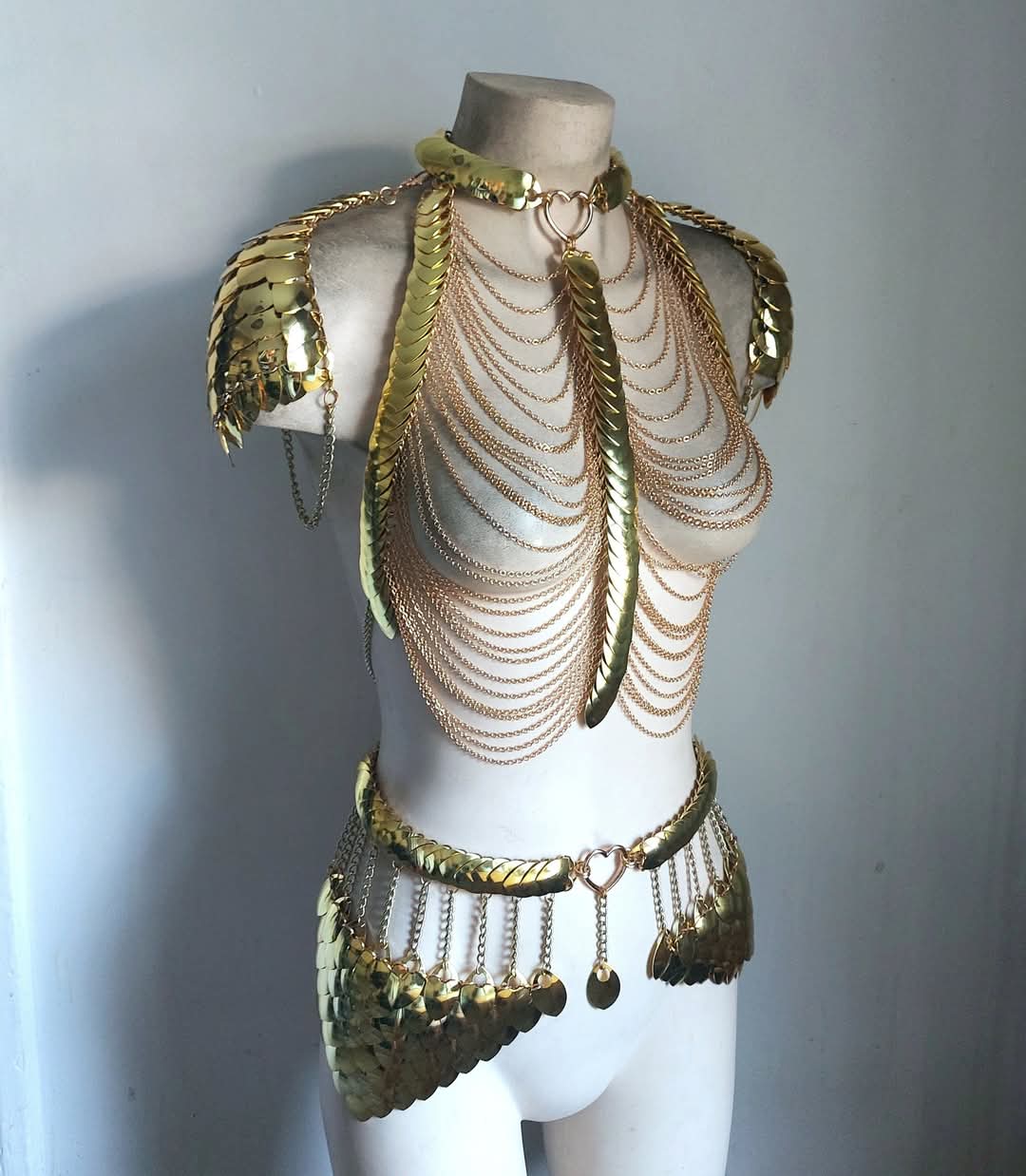 This awesome set is made with liquid gold & gold tone chains & brass chainmail. Shoulders are detachable.