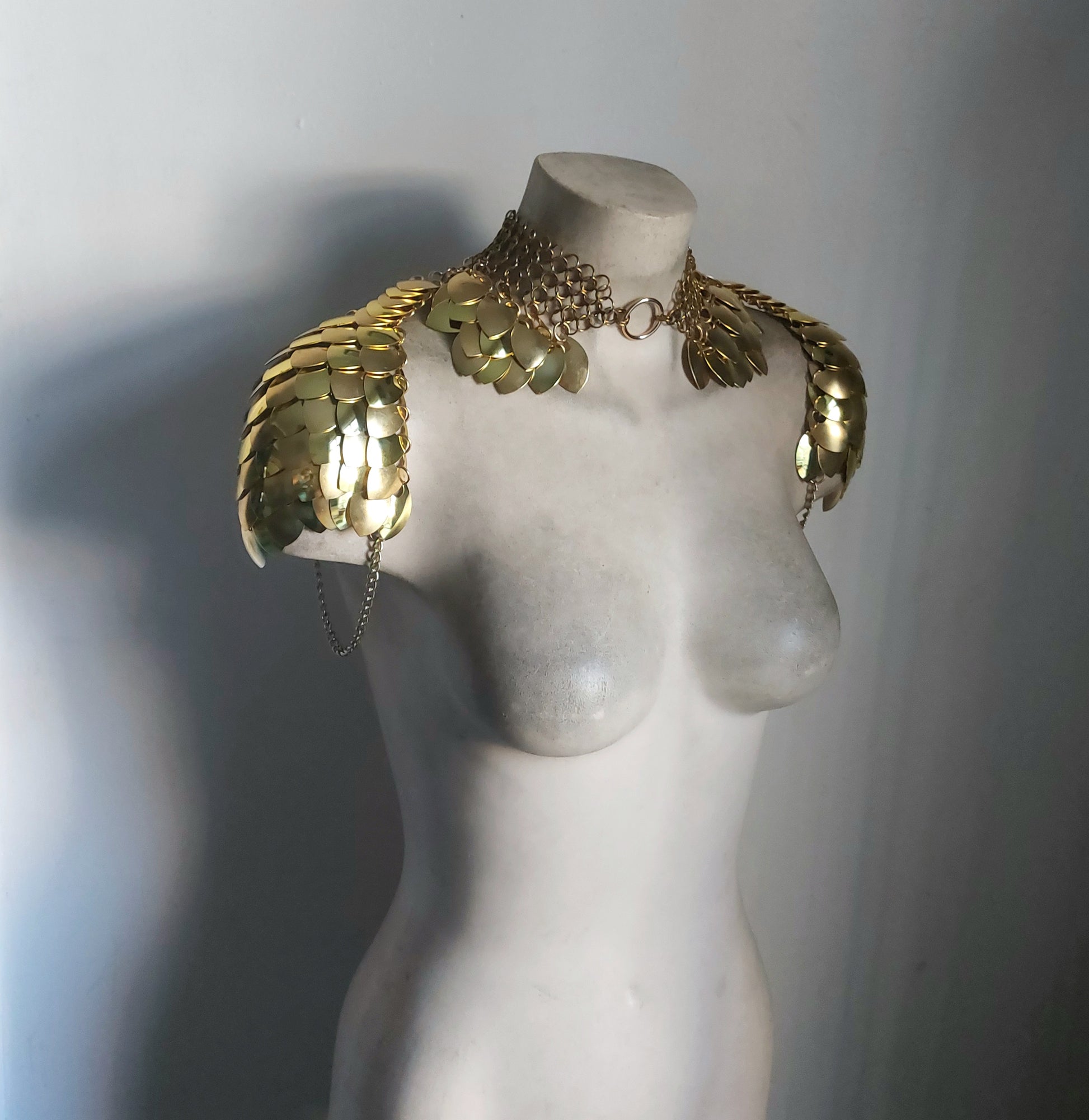 Created with our new brass & premium liquid gold scales. This style has gold tone brass chainmail blended in with the gold scalemail. Gold tone hardwear.