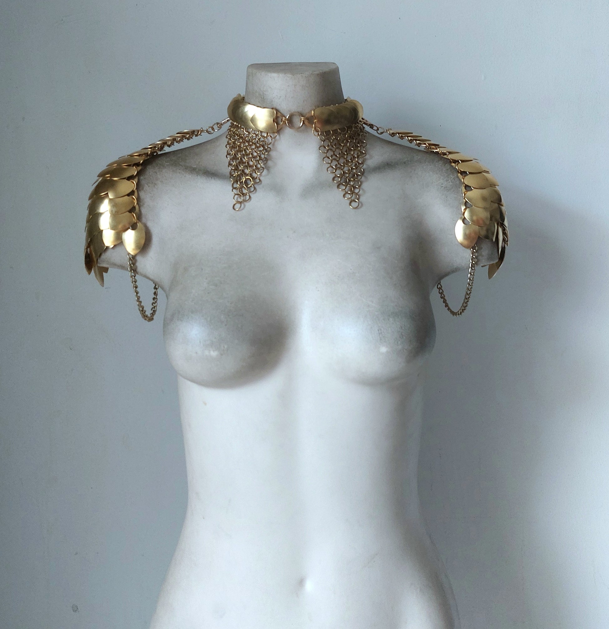 Constructed out of a combination brass chainmail & scalemail with a high neck. Shoulders are detachable from the collar. Features a 1cm o-ring accent.