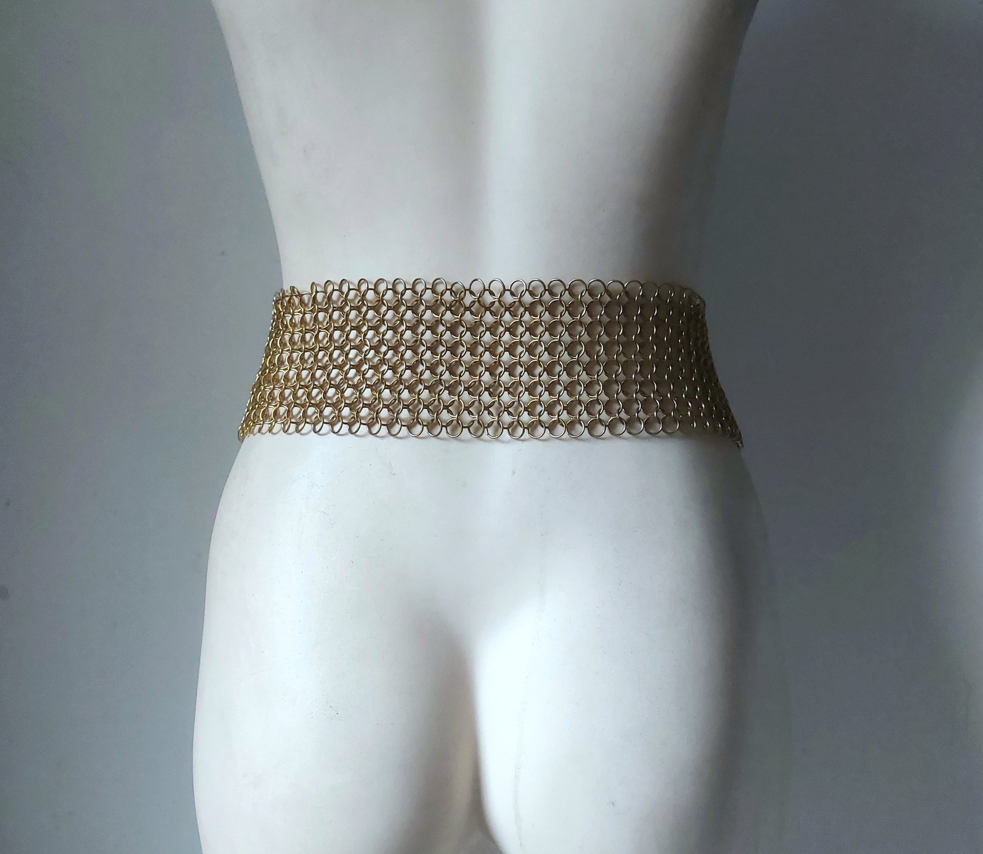 Constructed out of brass/gold tone chainmail with 8 1" o-ring accents & scalemail trim. This corset belt laces up with brass chains in the front.