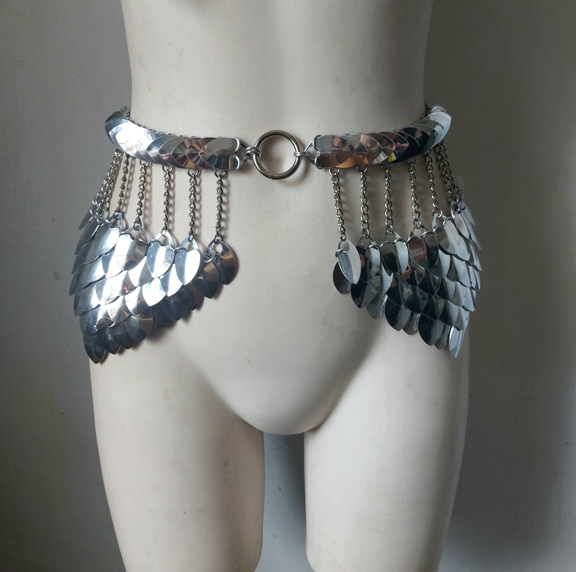 Constructed out of a combination of bright aluminum chainmail and scalemail. This style clips shut in the back & features a large 1.5" O-ring accent. The back is adjustable with a durable clip & aluminum chain.
