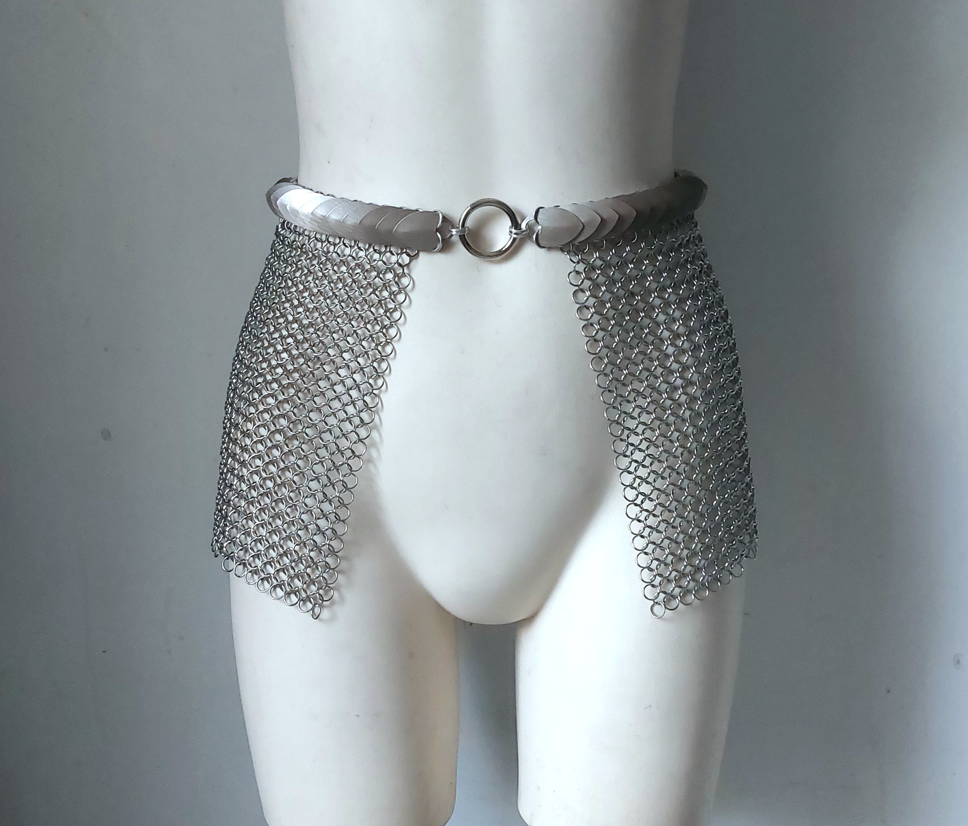 This beautiful chainmail belt is created with acenting scalemail, silver stainless steel chainmail sides with a large 1" oring front. Adjustable from the back.