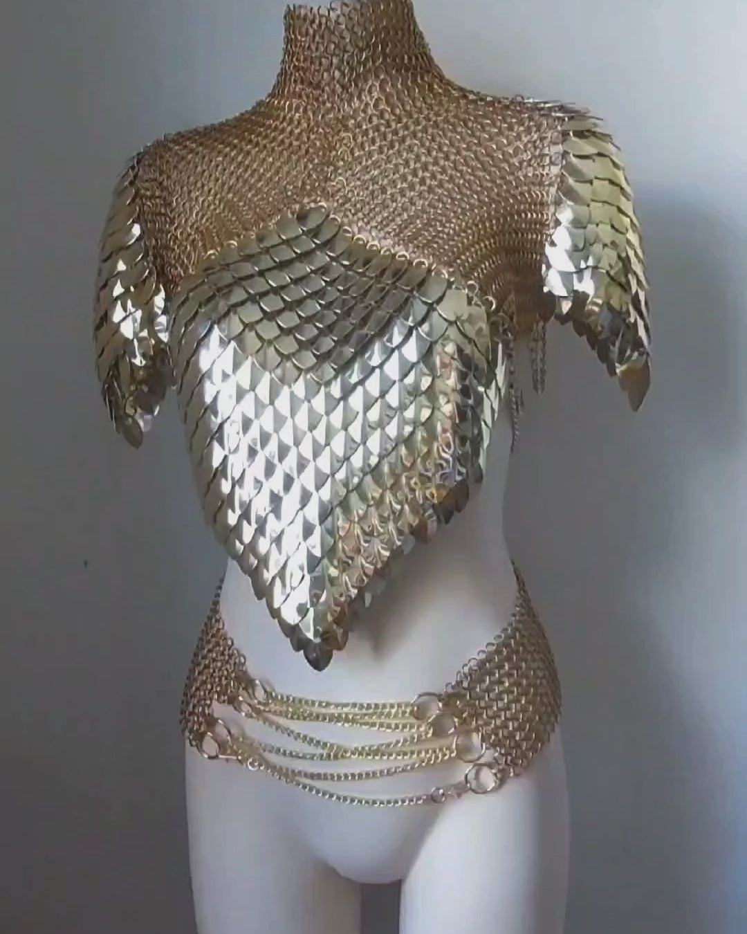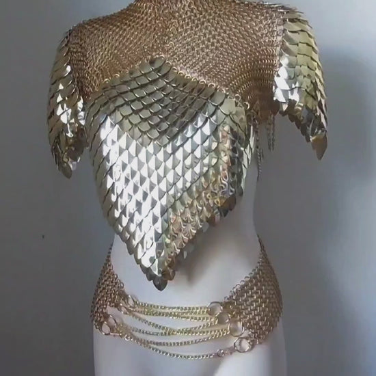 Our #Gabriel gold #chainmail armor with a matching gold corset style belt. Created with brass chainmail & gold mirror #scalemail with gold tone hardwear.