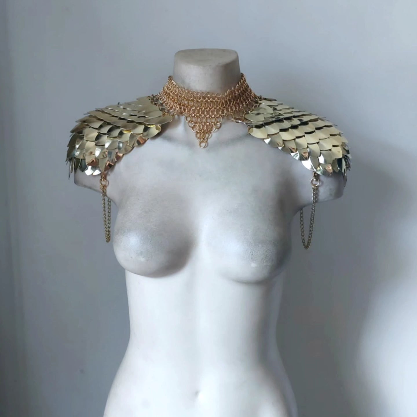 Constructed out of a combination of gold aluminum chainmail and aluminum scales. This high collared armor top features a chainmail collar & curved shoulder hugging armor.