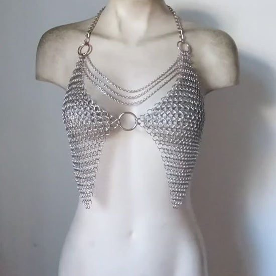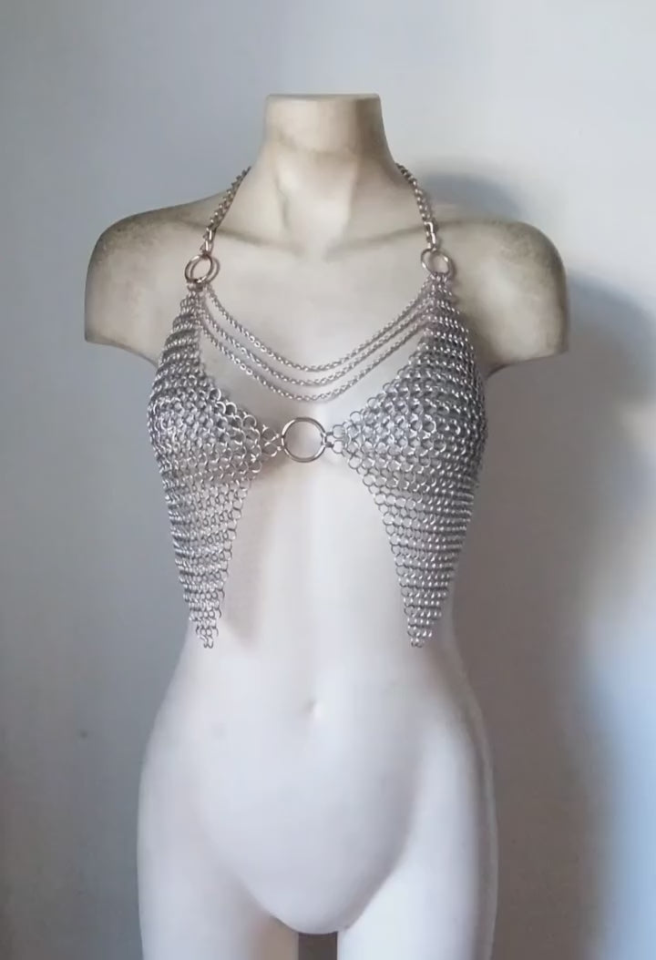 Constructed out of a combination of stainless steel chainmail, with 2.5cm stainless steel o-rings & steel curb chains. The stainless steel straps are adjustable from the back.