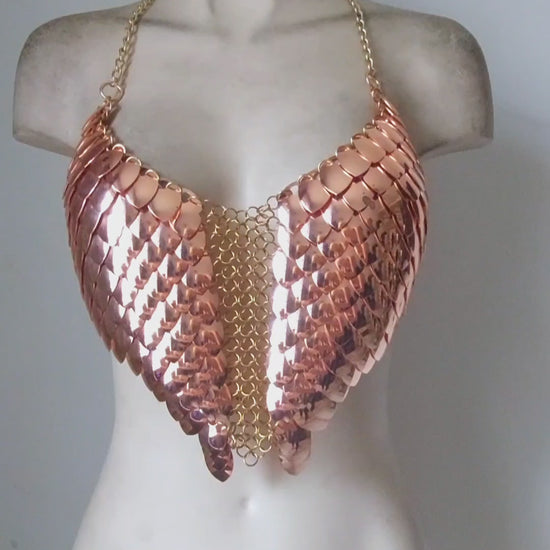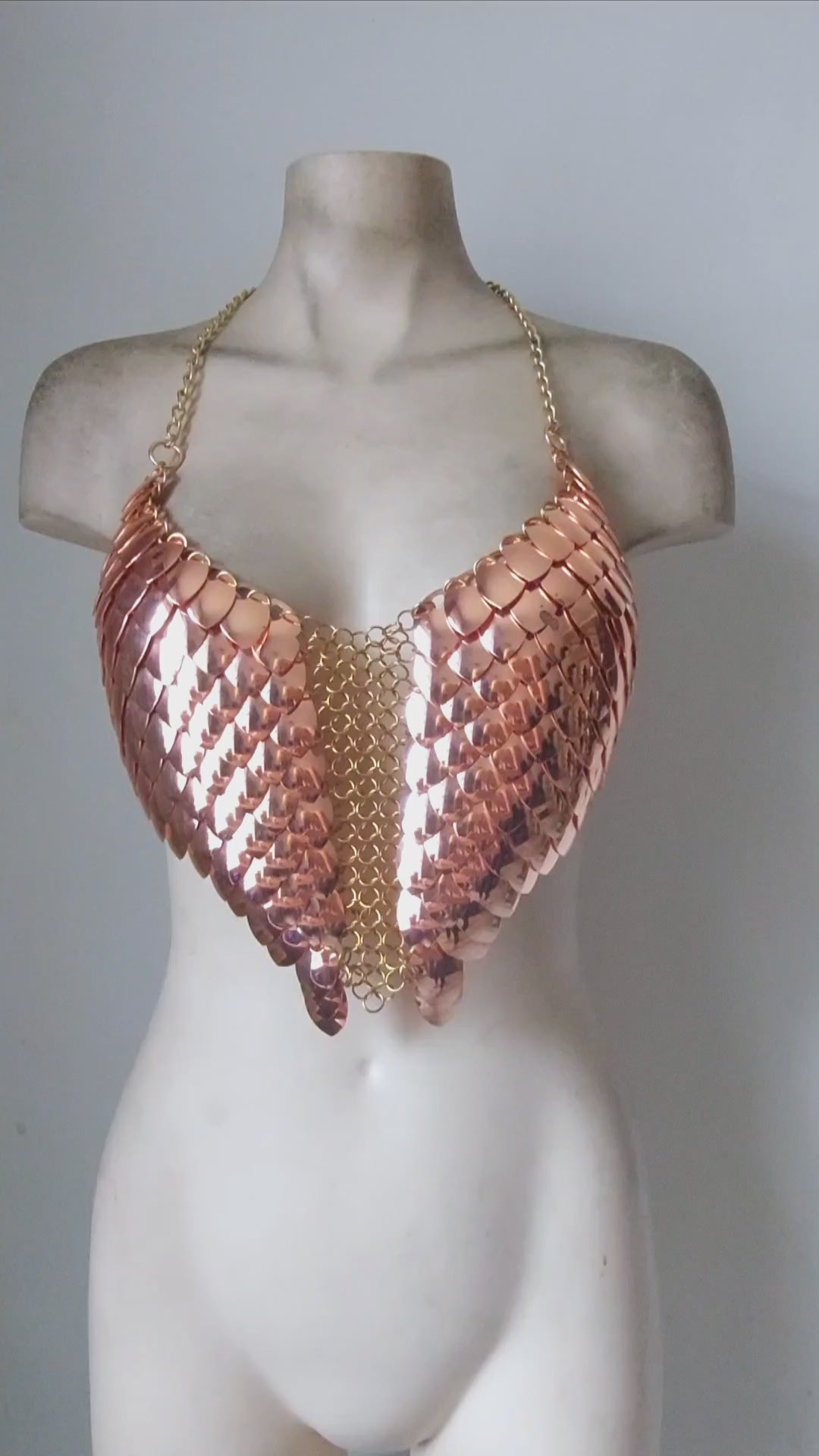 Constructed out of a combination of woven brass chainmail & scalemail with a chainmail front. Has clip closures on the neck and back for an adjustable fit. 1cm oring acents.